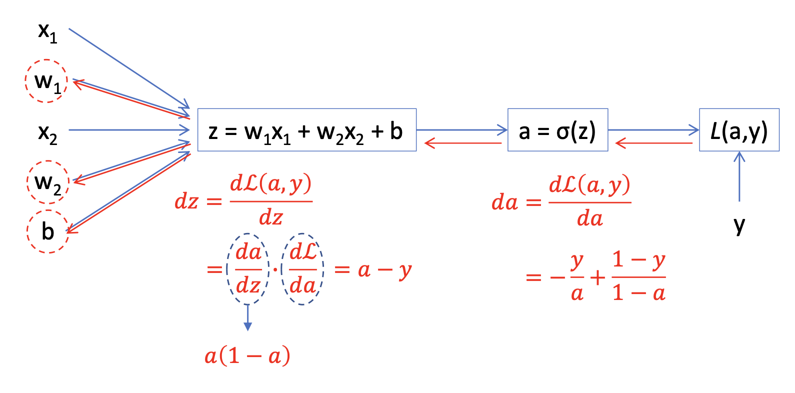 $dw_1 = \frac{dL(a, y)}{dw_1} = \frac{dL}{dz} \cdot \frac{dz}{dw_1} = x_1 \cdot dz = x1 \cdot (a-y)$