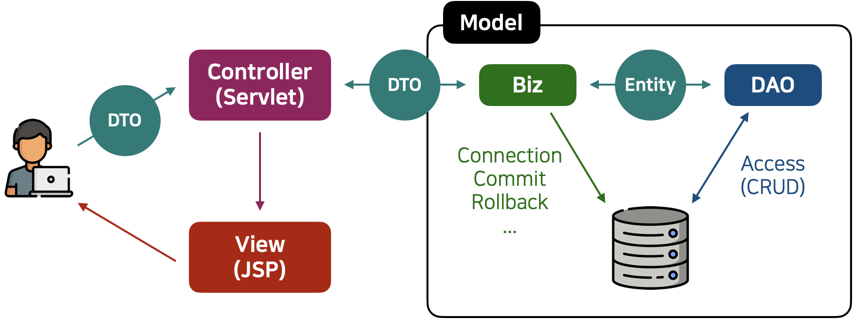 - JSP ↔ Controller : DTO로 데이터가 전달된다.