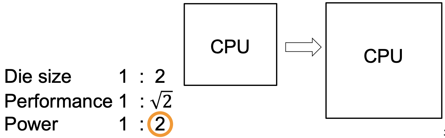 점점 발전함에 따라 프로세서 성능 개선에 있어서 diminishing return과 한계까지의 power consumption의 증가로 인해 발전이 힘들어졌다.