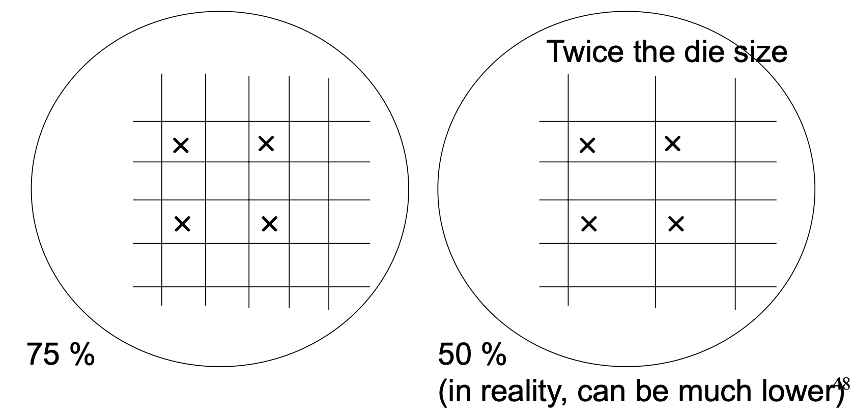 - die의 크기를 제곱한 것에 비례해서 yield는 감소한다.