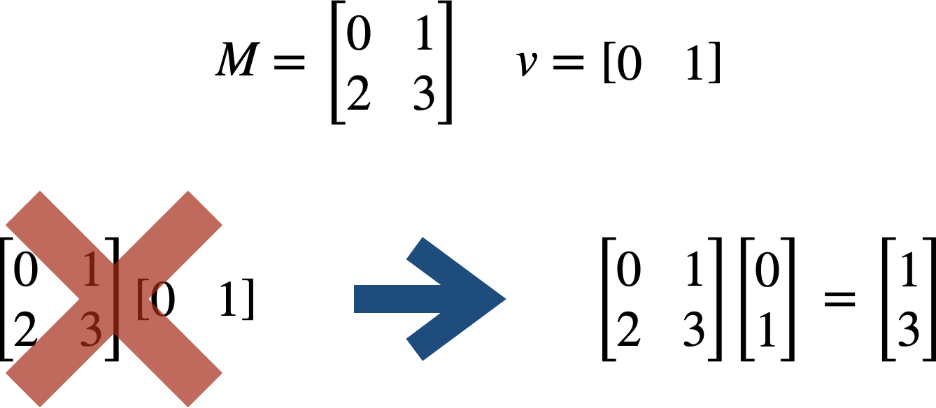 ☞ 원래는 (2*2)와 (1*2) 이기 때문에 계산을 하지 못하지만 numpy는 v를 (2*1)로 바꾸어 생각해서 연산이 가능해진다.