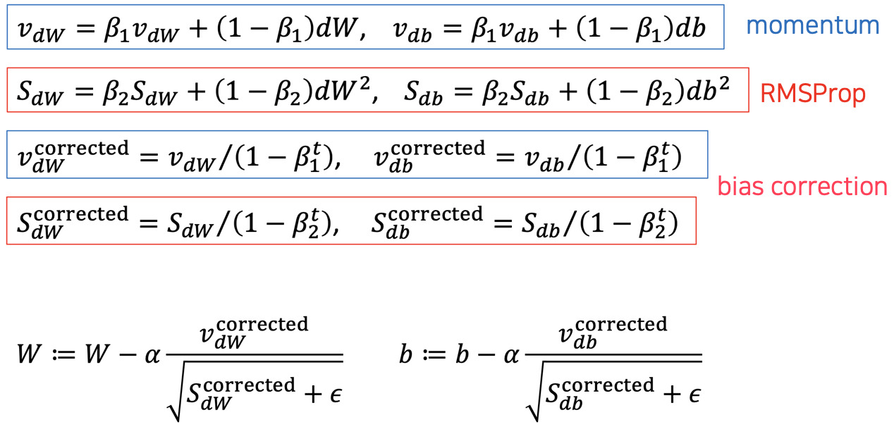 - Gradient descent with momentum과 RMSProp이 결합된 형태이다.