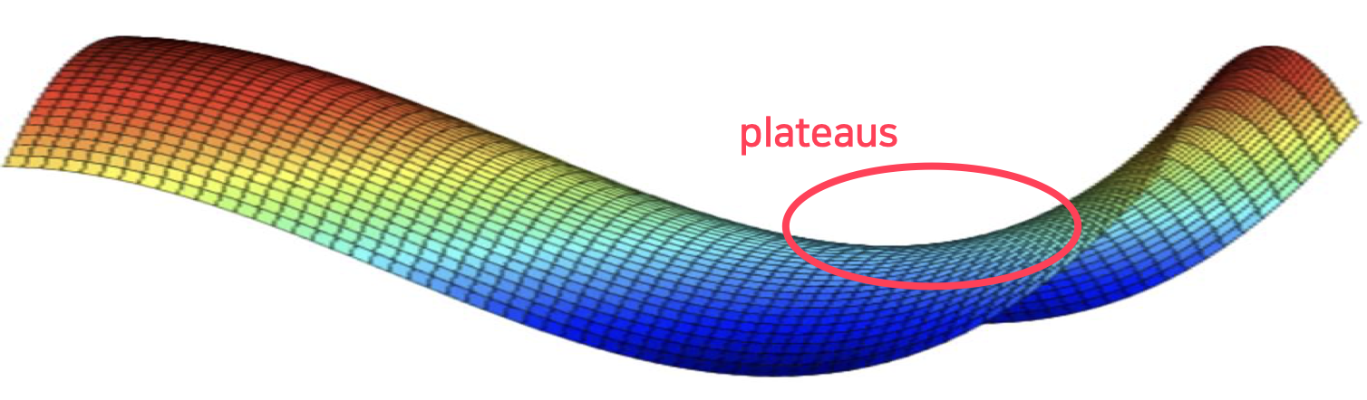 Plateaus는 평평한 구간으로 인해 gradient가 0에 가까운 경우(혹은 0)를 말한다.