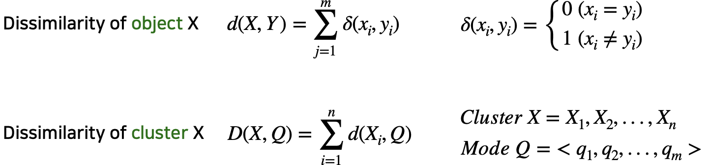 Object 간의 dissimilairty는 simple matching을 이용하고, cluster 내의 dissimilarity는 각 object와 mode의 dissimilarity의 합으로 정의한다.