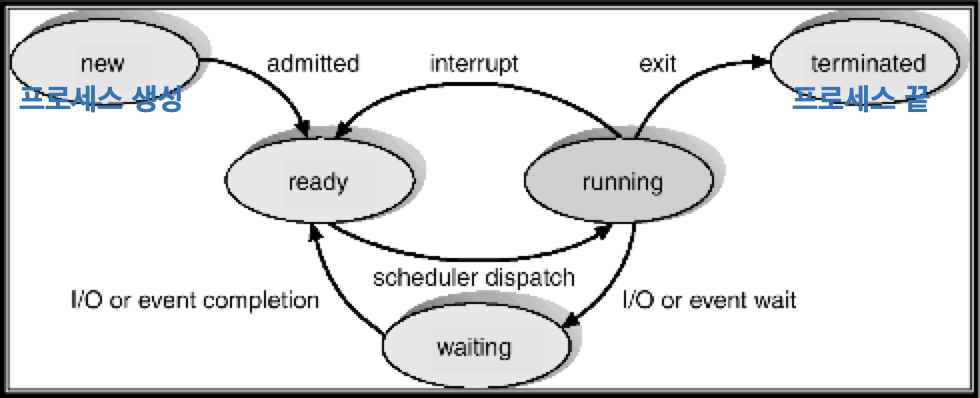 - waiting : process가 event를 기다리고 있음(O/O completion, signal reception 등)