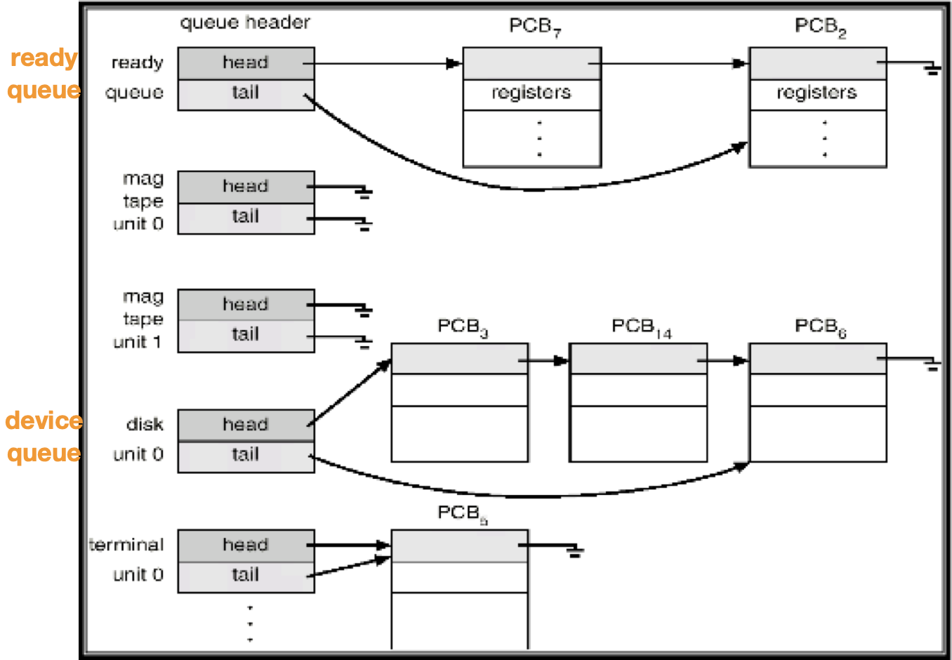 Ready queue와 device queue는 process의 상태와 맞물려서 들어있는 요소들이 바뀐다.