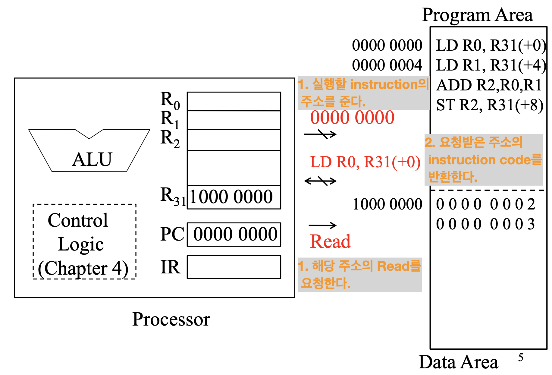 - Processor가 실행할 instruction의 주소를 memory로 read를 요청한다.