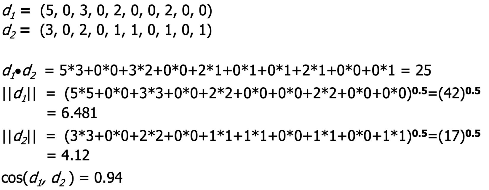 $cos(d_1, d_2) = \frac{(d_1 \cdot d_2)}{ ||d_1 || \times ||d_2||}$