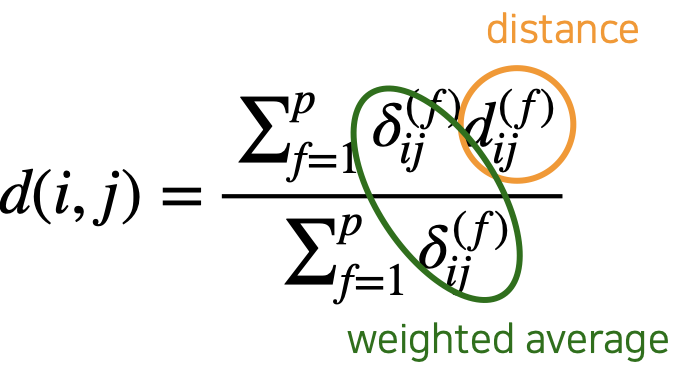 각 타입의 attribute에 대해 distance를 구하고 이에 대해 weighted avearge를 취한다.