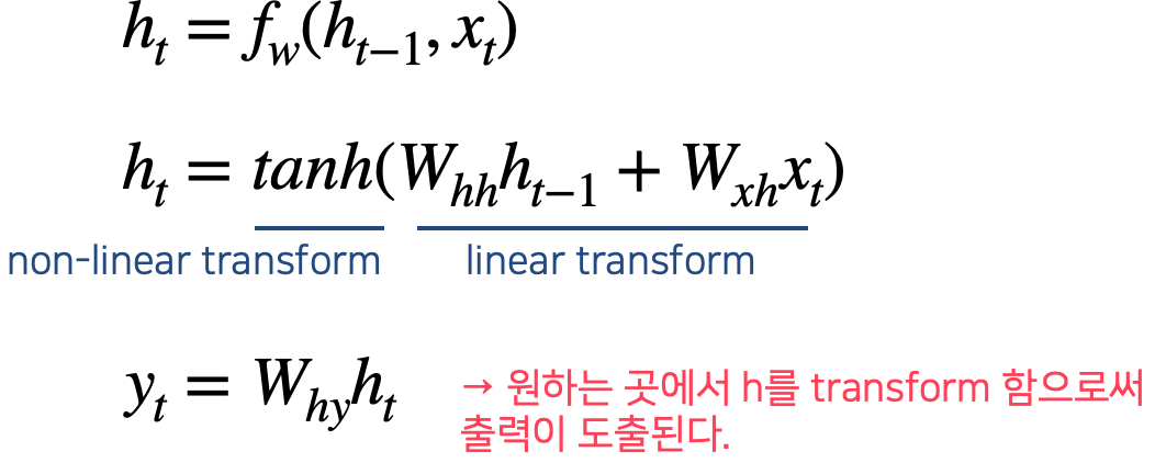 연산을 쭉 순차적으로 수행하다가 원하는 곳에서 $h_t$를 transform하면 $y_t$가 도출된다.