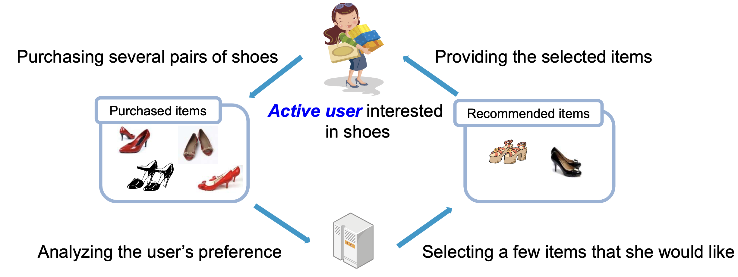 사용자가 과거에 평가/구매/검색했던 history를 이용해서 사용자의 취향을 찾아내고 사용자가 좋아할 만한 아이템을 추천하는 시스템이다.
