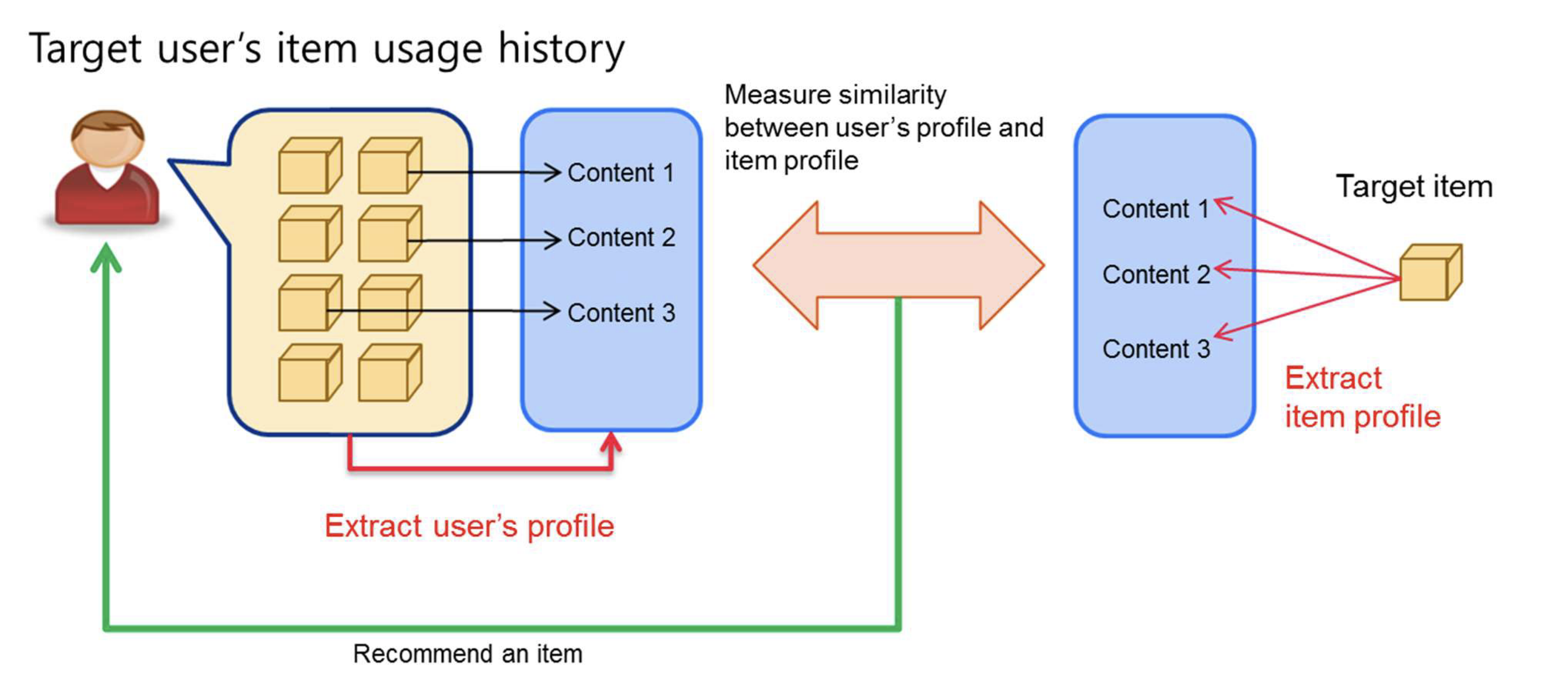 - 과거에 사용자가 구매했던 item list로부터 content를 꺼내서 결합하고, 사용자가 보지 않은 아이템으로부터 추출한 content와 similarity를 비교하여 높은 similarity의 item을 추천한다.