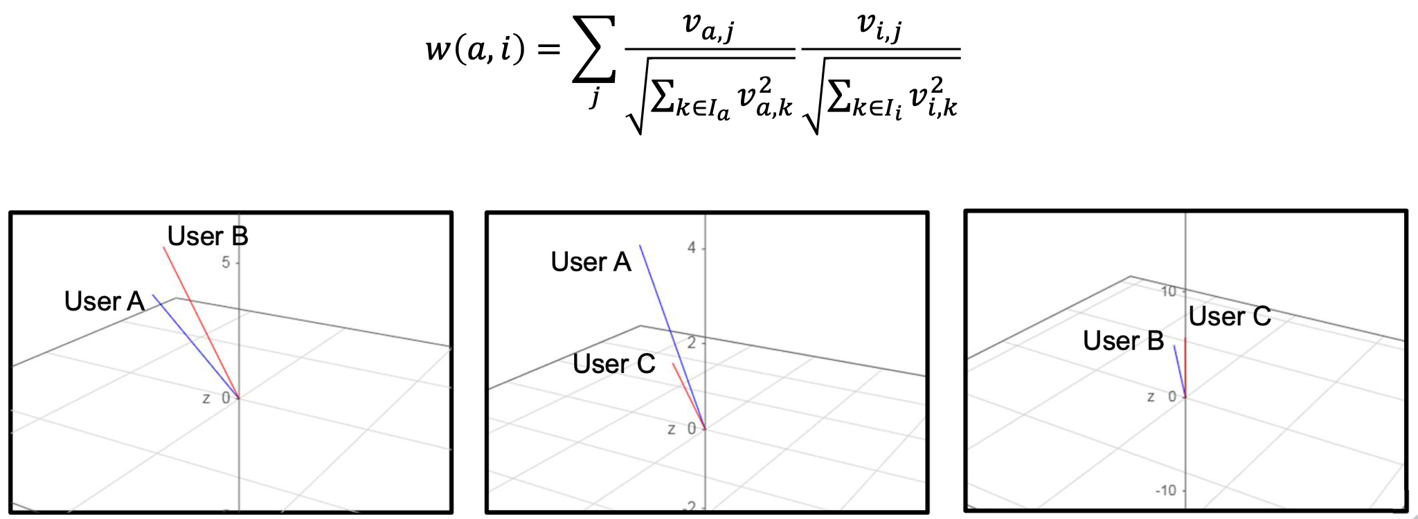 - Cosine similarity : 공통으로 존재하는 item의 차원에서 방향을 고려하여 similairty를 계산한다.