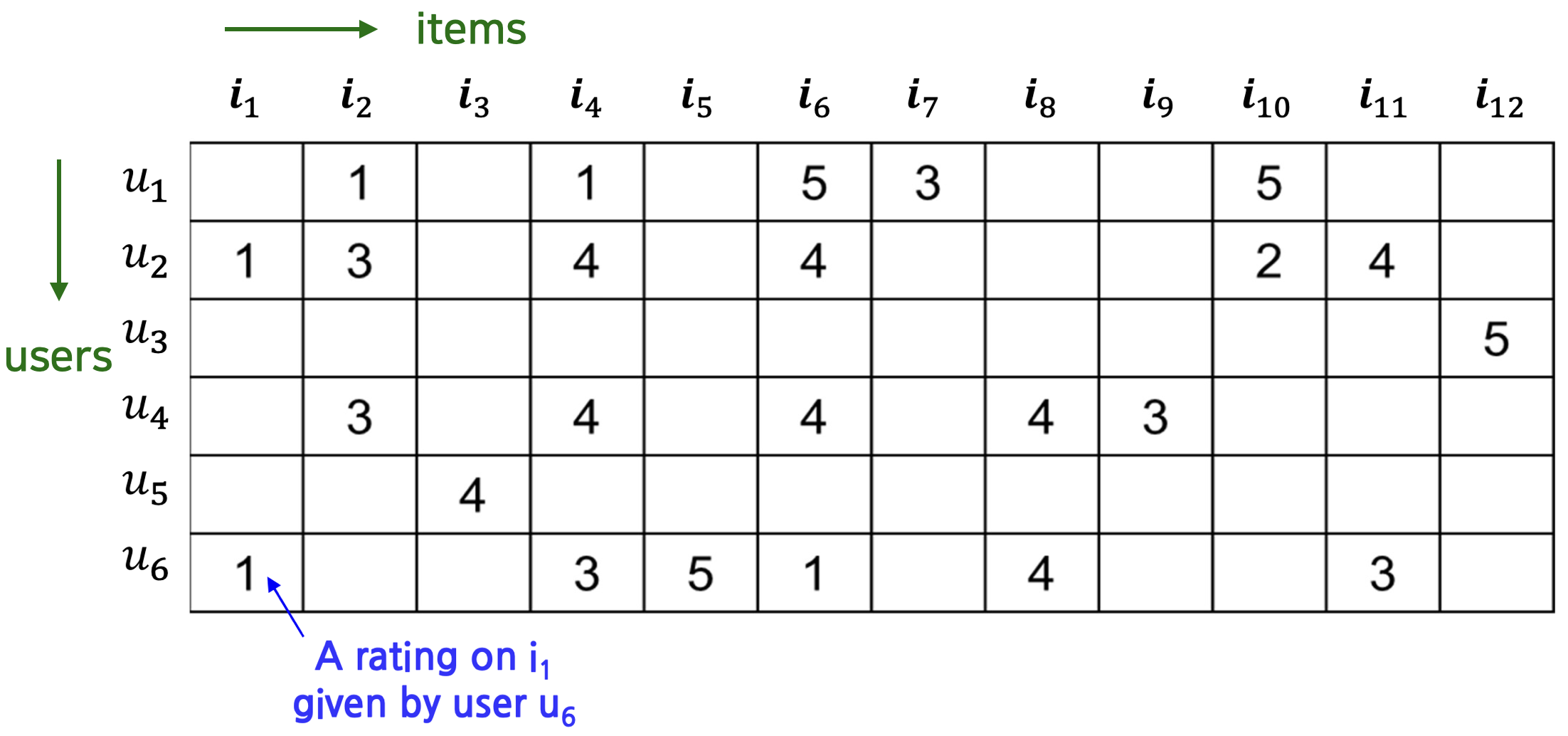row : user, column : item으로 하여 user가 item을 좋아하는 점수를 표현한다.