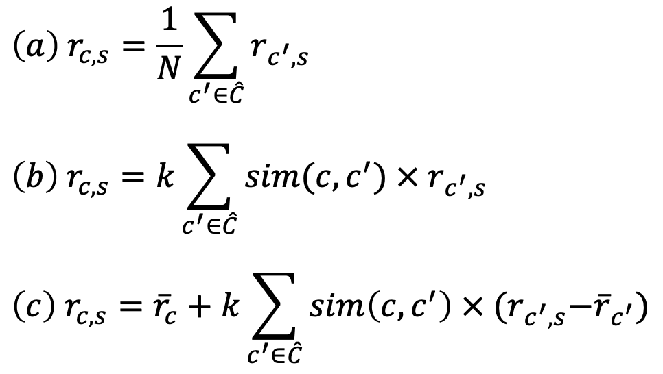 - $r_{c, s}$ 추정 : 이웃들의 점수에 기반해서 내가 그 아이템에 점수를 어떻게 줄 것인지 추정한다.