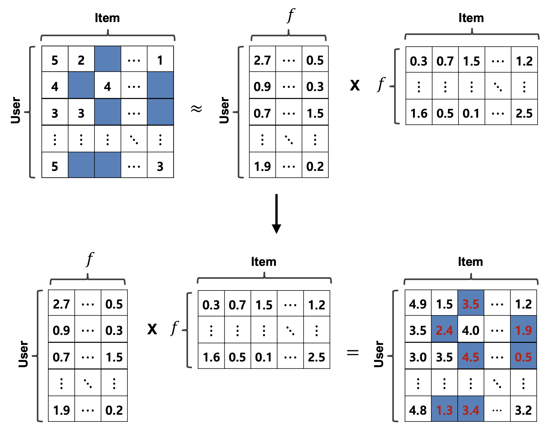 - 나눠진 user feature과 item feature을 다시 곱하면 몰랐던 정보를 알 수 있다.