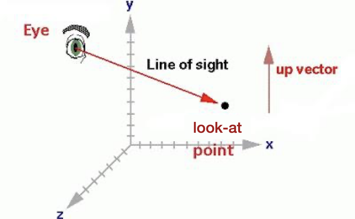 <pre>gluLookAt(eye_x, eye_y, eye_z, at_x, at_y, at_z, up_x, up_y, up_z)</pre>
