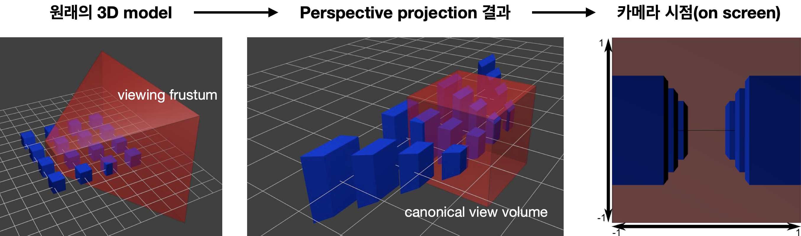 Perspective projection은 viewing frustum을 canonical view volume으로 매핑하는 것이다.