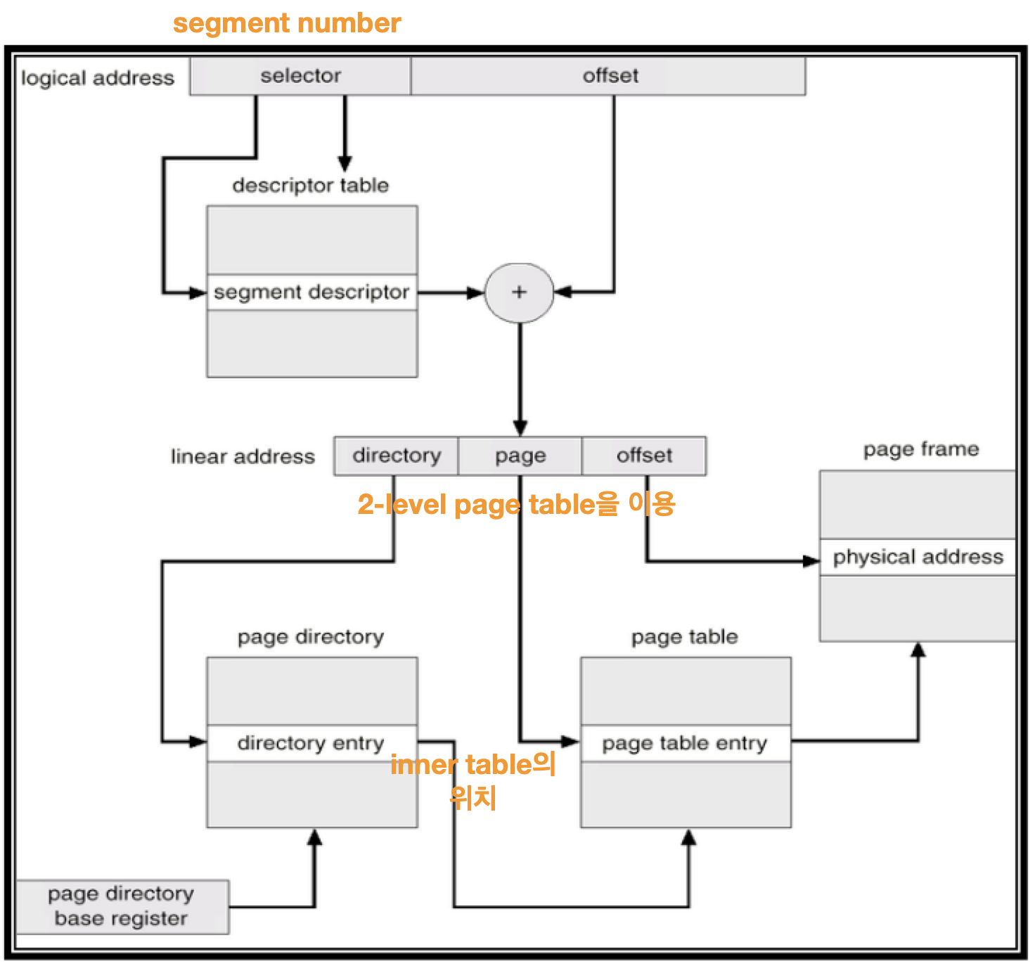 Segment table 대신 descriptor table, segment number 대신 selector라는 용어를 사용한다.