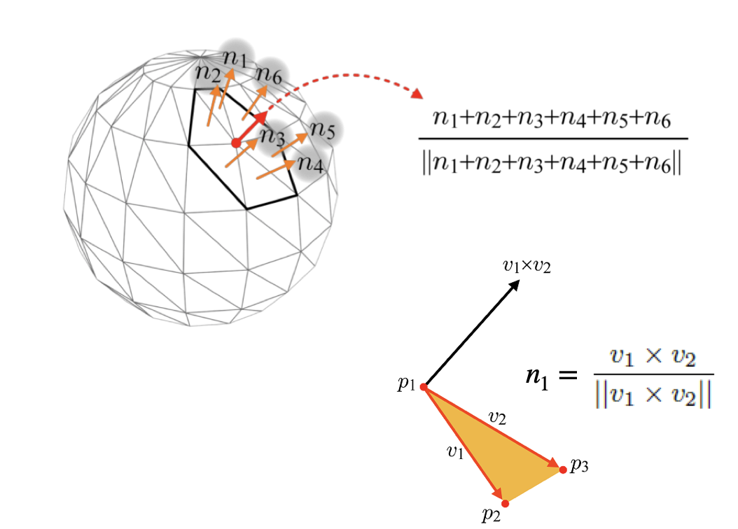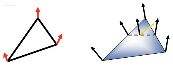 한 점에서의 normal(vertex normal)은 인접한 polygon 들의 face normal의 평균의 unit으로 한다.