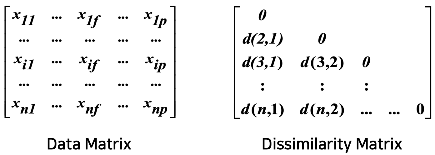 - 데이터의 similarity(dissimilarity)의 관계를 n*n matrix로 표현한다.