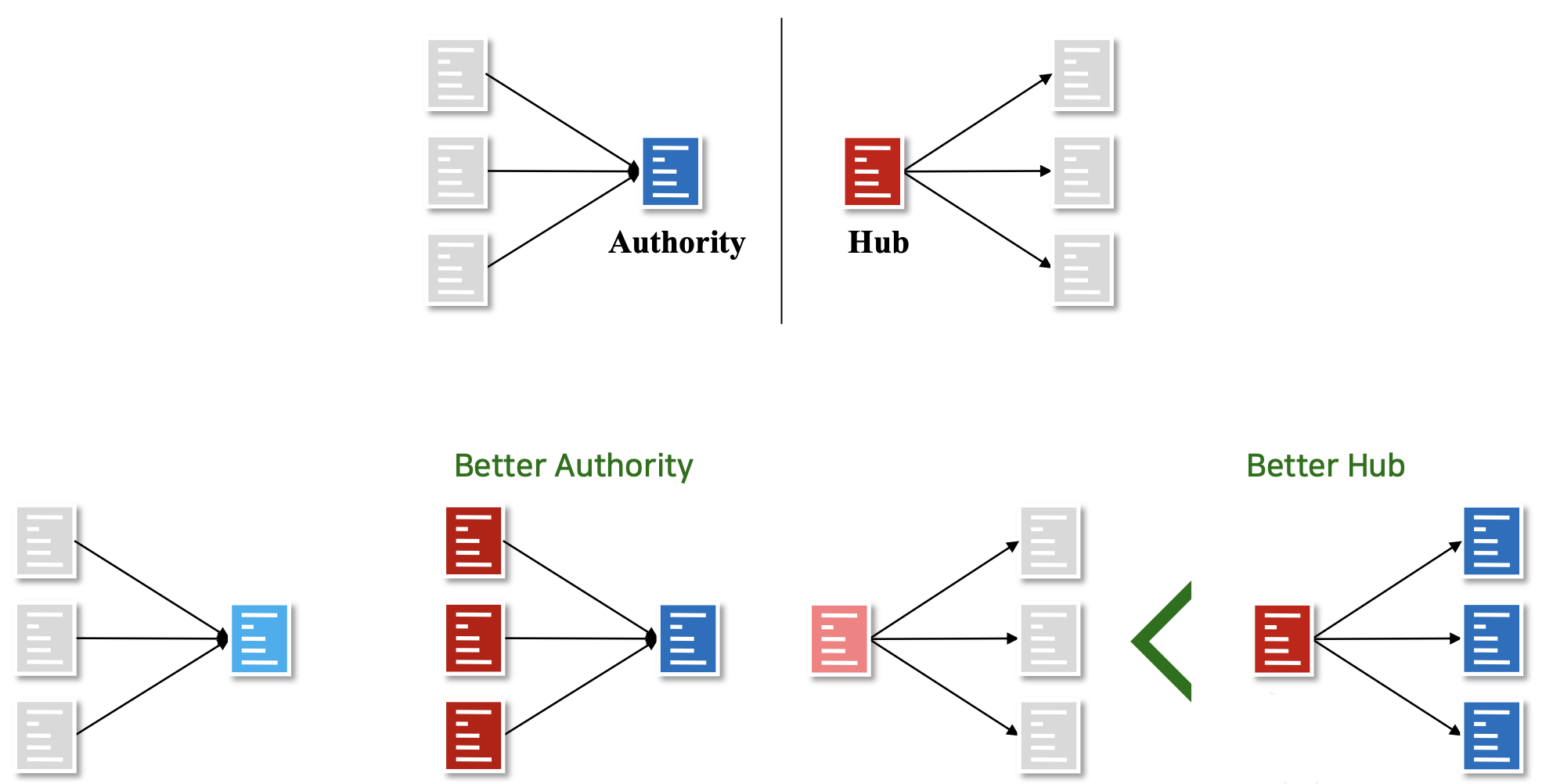 일반 페이지로 out-link가 가는 것 보다는 authority로 out-link가 가는 것이 더 좋은 hub이기 때문이다.