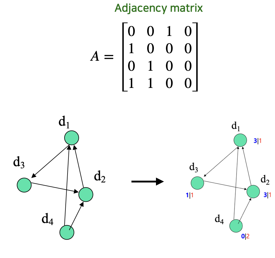각 페이지는 hub score($h(d_i)$)와 authority score($a(d_i)$)를 갖는다.