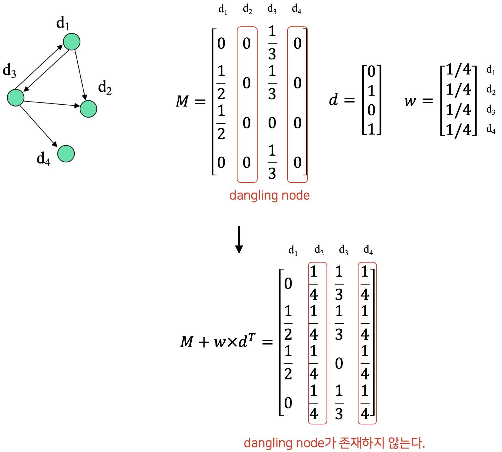 - dangling node : iteration이 지날수록 점수가 한 페이지로 몰린다.