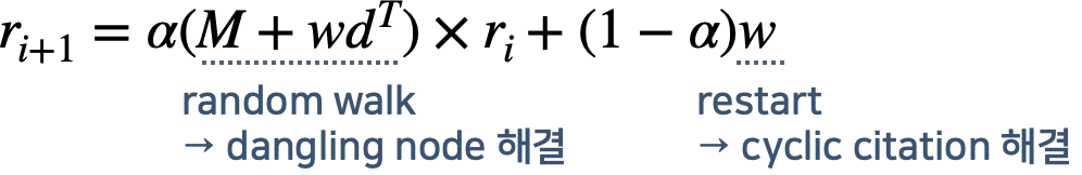 Random walk의 방식으로 인해 dangling node의 문제를 해결할 수 있고, restart의 방식을 통해 cyclic citation 문제를 해결할 수 있다.