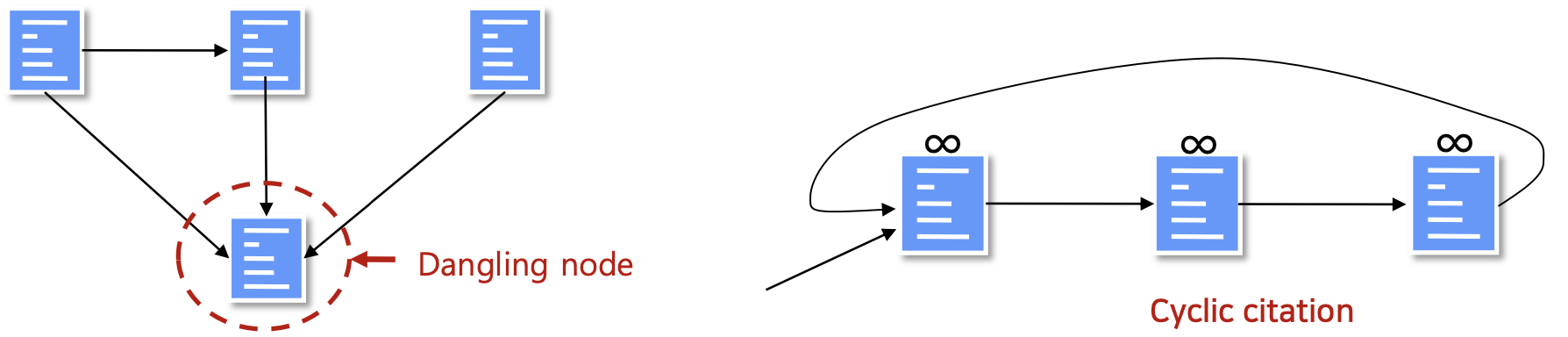그러나 이런 방식으로 수행하게 되면 dangling node와 cyclic citation으로 인해 문제가 발생한다.