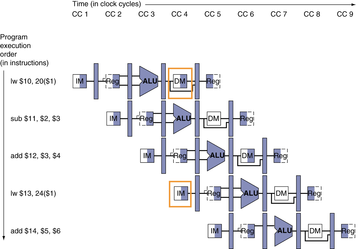 아래 4번째 cycle에서 첫번째 instruction은 data memory를 read 하고 있고, 4번째 instruction은 instruction fetch를 하고 있다.