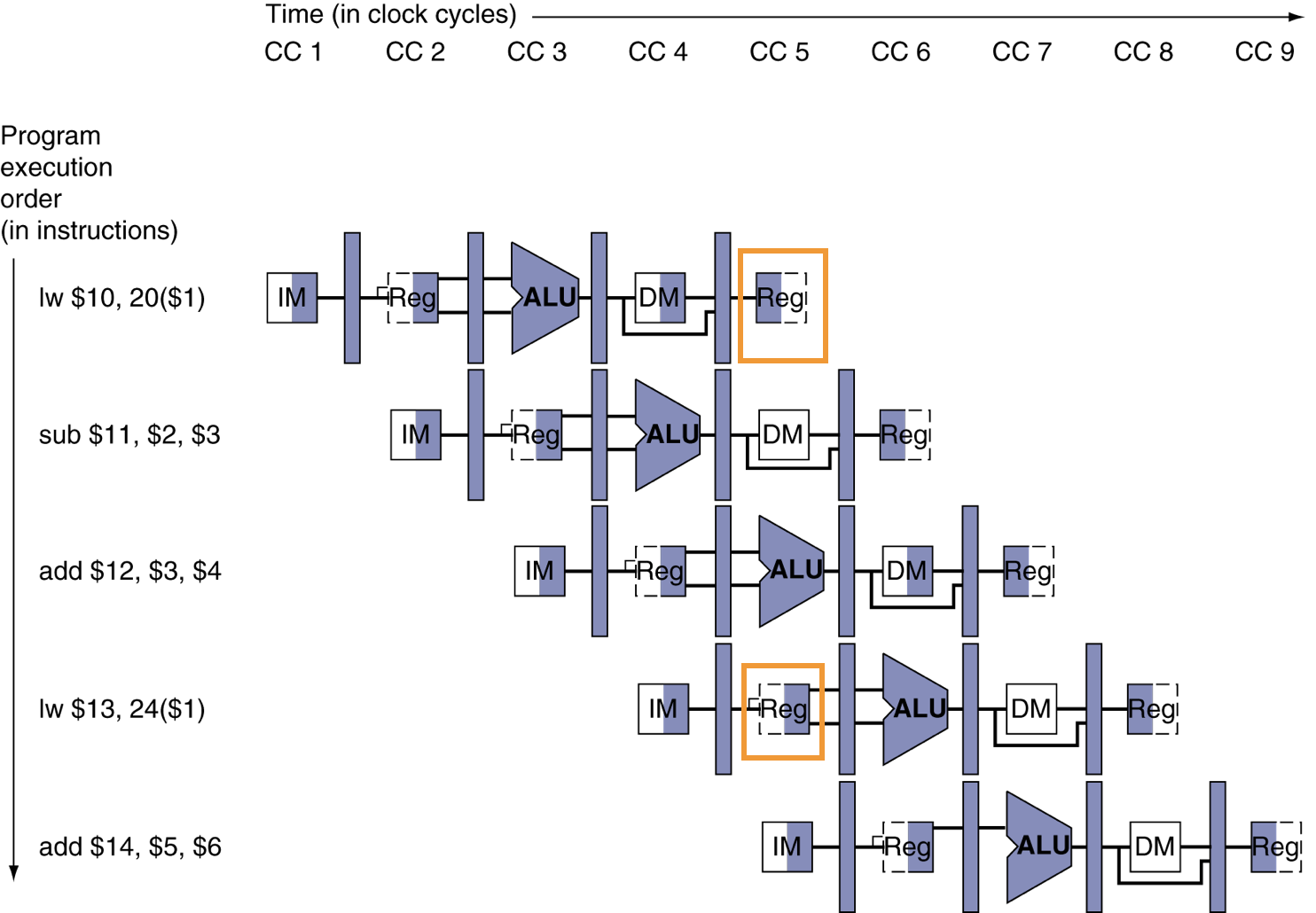 그러나 5-stage MIPS에서는 하드웨어적으로 해결하기 때문에 structure hazard가 없다.