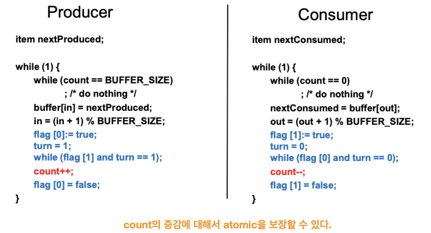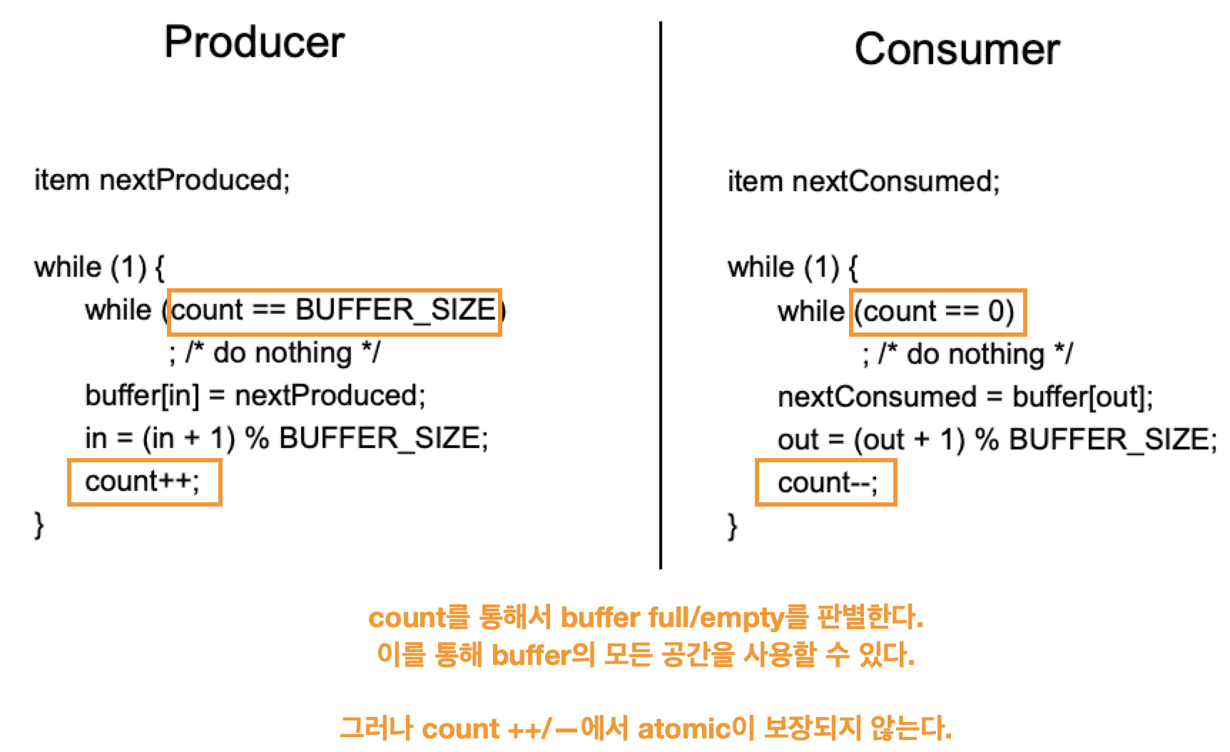 이를 해결하기 위해서 새로운 variable <pre>counter</pre>를 사용해서 synchronization을 한다.