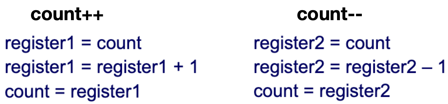 위의 어셈블리 코드가 수행될 때 한 스레드에서 count++을 하다가 중단되고 다른 스레드에서 count--를 하면, 정상적인 결과를 낳지 못한다.