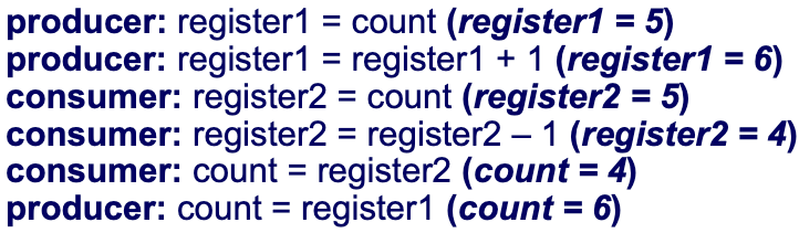 count의 값이 5일 때 producer에서 ++ 하고 consumer에서 -- 하는 작업을 수행 중이라고 하자.